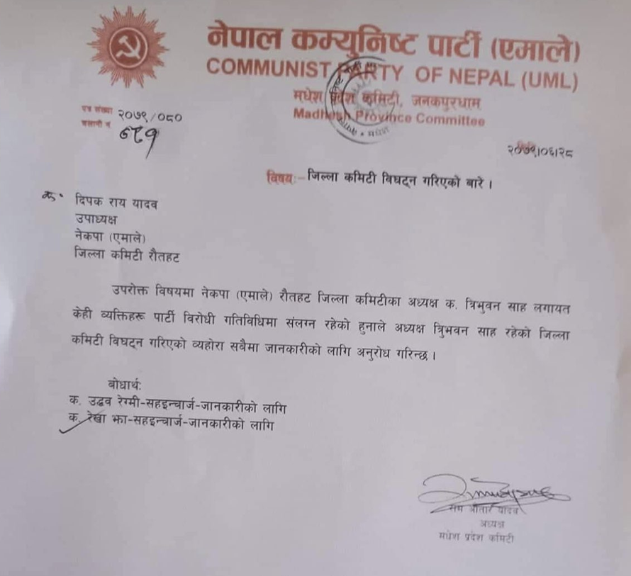 एमालेको मधेश प्रदेश कमिटीका अध्यक्ष रामऔतार यादवले शुक्रबार एक विज्ञप्ति जारी गरी जिल्ला कमिटी अध्यक्ष त्रिभुवन साह लगायतका केही व्यक्तिहरु पार्टीविरोधी गतिविधिमा लागेकाले जिल्ला कमिटी विघटन गरेको बताएका छन् ।