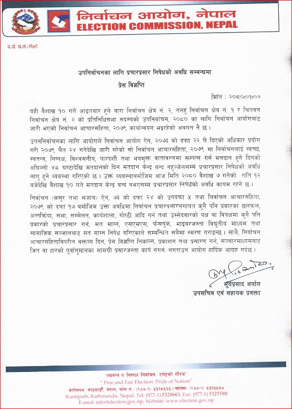 उपनिर्वाचन सकिएर मतदान केन्द्र बन्द नहुन्जेलसम्म प्रचार प्रसार निषेध गरिएको निर्वाचन आयोगले जनाएको छ ।