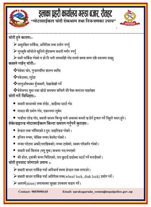 ती व्यक्तिहरूले पार्किङमा रहेको मोटरसाइकललाई केही मिनेटमै सजिलै चोरेर लगेका छन् । यस घटनाले स्थानीयहरूमा त्रास फैलिएको छ, किनभने यो घटना इलाका प्रहरी कार्यालयको नजिकै भएको हो, जहाँ शान्ति सुरक्षाका लागि प्रहरीको उपस्थिति हुन्छ । यसअघि पनि गरुडा क्षेत्रबाट थुप्रै मोटरसाइकल चोरी भएका छन्, जसका कारण स्थानीय जनताले सुरक्षा व्यवस्थामा प्रश्न उठाएका छन् ।