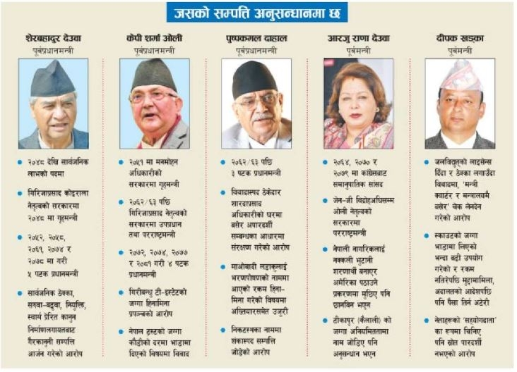 काठमाडौँ, ३१ असोज। सम्पत्ति शुद्धीकरण अनुसन्धान विभागले तीन पूर्वप्रधानमन्त्री र दुई पूर्वमन्त्रीका नाममा भएका चल–अचल सम्पत्तिको खोजबिन थालेको छ । सार्वजनिक ओहदा दुरुपयोग गरी गैरकानुनी सम्पत्ति आर्जन गरेको आशंकामा विभागले पूर्वप्रधानमन्त्रीहरू शेरबहादुर देउवा, केपी शर्मा ओली र पुष्पकमल दाहाल तथा पूर्वमन्त्रीहरू आरजु राणा देउवा र दीपक खड्काको सम्पत्तिमाथि अनुसन्धान अघि बढाएको हो । छानबिनको दायरामा देउवा पुत्र जयवीरसिंह पनि परेका छन् ।